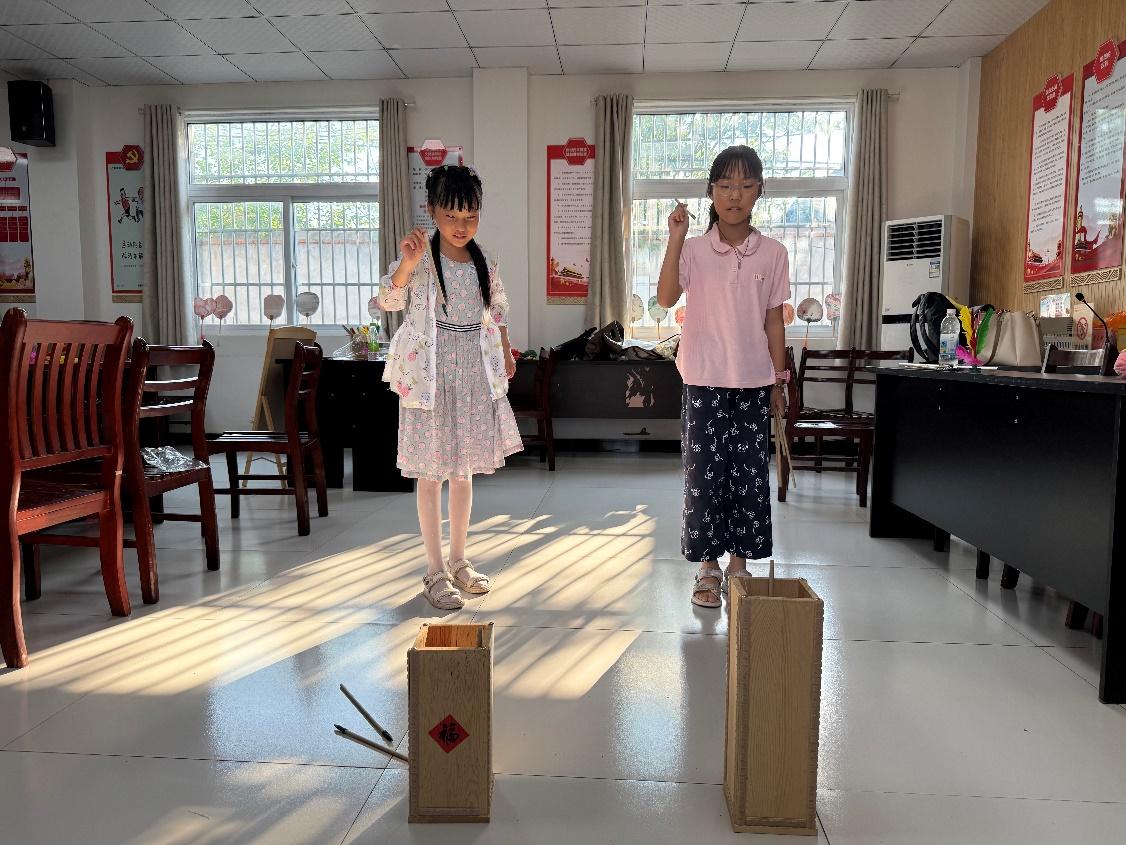 第二天的活動(dòng)更加精彩。在德育塑心的巧手百捶坊中,孩子們認(rèn)真地制作養(yǎng)生錘,小雨興奮地舉著作品說(shuō):“回去就給奶奶試試!”也許童稚話語(yǔ)里的體貼心意,比任何精巧的手工都珍貴。拓印帆布包活動(dòng)里,孩子們手中錘子的咚咚聲里藏著認(rèn)真, 有個(gè)孩子把三葉草拓在帆布包上,旁邊歪歪扭扭寫(xiě)著“送給奶奶”,原來(lái)花草的紋路里,能長(zhǎng)出最樸素的孝心。在體育強(qiáng)魄的飛羽風(fēng)云擂活動(dòng)上,投壺和踢毽子讓孩子們釋放活力,小小的場(chǎng)地充滿歡聲笑語(yǔ)。漆扇繪制和輕土泥塑更是讓孩子們的創(chuàng)造力得到充分發(fā)揮,一把把色彩斑斕的漆扇、一個(gè)個(gè)形態(tài)各異的泥塑,都是她們藝術(shù)靈感的體現(xiàn),通過(guò)她們我好像想起了小時(shí)候天馬行空的自己。