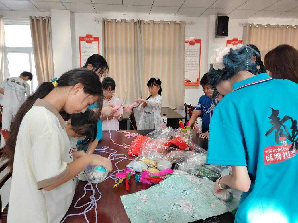 (圖為實(shí)踐團(tuán)成員與小朋友們一起制作艾草捶 圖攝張海)
