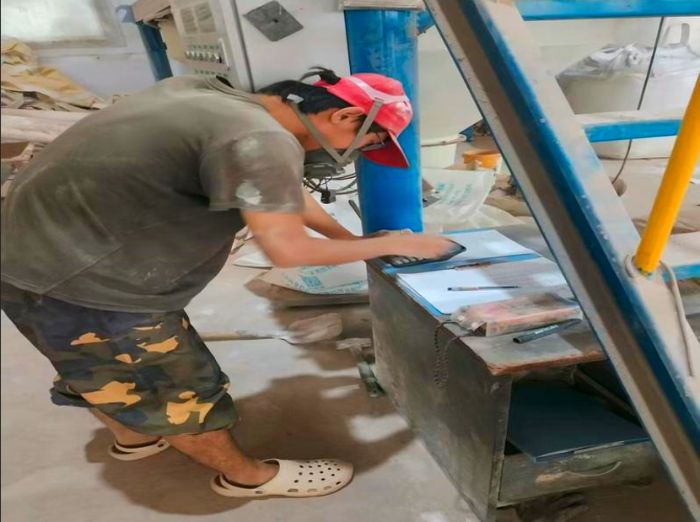 踏入車間,工作人員便融入忙碌的節(jié)奏中。在原料處理區(qū),他跟著技術(shù)員李師傅學(xué)習(xí)操作,看著不同型號(hào)的粘土,認(rèn)真的計(jì)算配比,筆記本上計(jì)入了今天的用料和剩余粘土,嚴(yán)格按照控制誤差,按要求戴面罩,確保原料靳準(zhǔn)投進(jìn)攪拌罐。