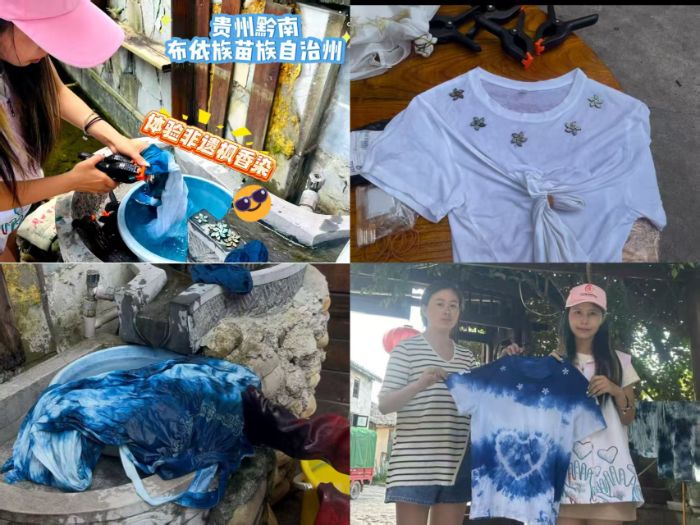 在傳承人的指導(dǎo)下,志愿隊(duì)成員親身體驗(yàn)了楓香染制作流程。制作分為兩種模式:簡(jiǎn)單模式即通過(guò)皮筋扎緊衣物,用板夾固定圖案后浸入染料,三分鐘后取出清洗即可完成;復(fù)雜模式則需先用金色液體在衣物上勾勒?qǐng)D案,耗時(shí)約三小時(shí)乃至更久,且金色液體勾勒的圖案在后續(xù)染色中不會(huì)被浸染,能完整保留設(shè)計(jì)形態(tài)。親身實(shí)踐讓團(tuán)隊(duì)成員更深刻地感受到非遺技藝的精巧與傳承的不易。