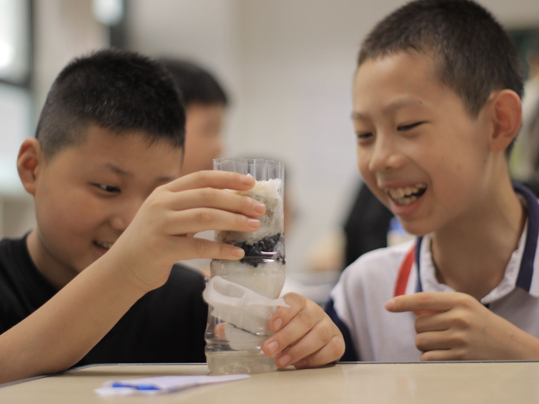 圖為孩子們開心的制作簡(jiǎn)易凈水器
