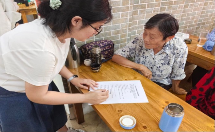 隨后便是宣講活動,在開始之前,隊員們進行了一個小小的問卷調查,考慮到老人或許有文化程度不高,認字不清等情況,隊員們采用了訪談形式,問卷內容涵蓋老人社交情況、身體狀況、精神文化需求以及對基礎設施的滿意程度等方面。隊員們逐字逐句的念出問題,并用方言等加以解釋,使問題更加通俗易懂,讓老人可以更清楚地了解問卷的內容,從而準確的說出自己的答案,隊員們仔細記錄下他們的回答隨后匯總成表格。