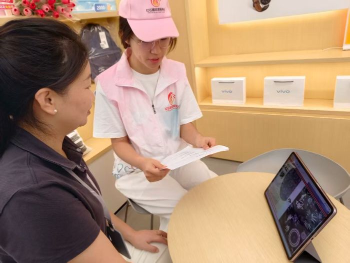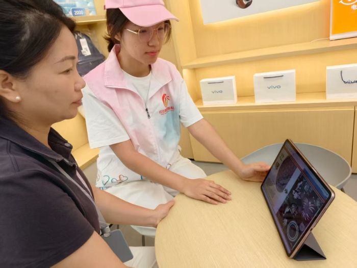 8月27日,志愿隊(duì)首先在寶應(yīng)縣吾悅廣場(chǎng)vivo線下門(mén)店開(kāi)展文化宣傳活動(dòng)。志愿者們身著統(tǒng)一服裝,借助門(mén)店平板設(shè)備展示侗族特色圖案,包括侗族刺繡紋樣、鼓樓建筑輪廓等文化符號(hào),向顧客詳細(xì)講解圖案背后的文化寓意。例如,侗族刺繡中的花鳥(niǎo)圖案象征著對(duì)自然的敬畏,幾何圖形則代表著民族的歷史記憶。此外,志愿者還通過(guò)文字資料補(bǔ)充介紹了侗族的傳統(tǒng)節(jié)日,如薩瑪節(jié)的祭祀流程、合攏宴的熱鬧場(chǎng)景,以及侗族大歌的多聲部合唱特色,引導(dǎo)顧客從多角度深入了解侗族文化。