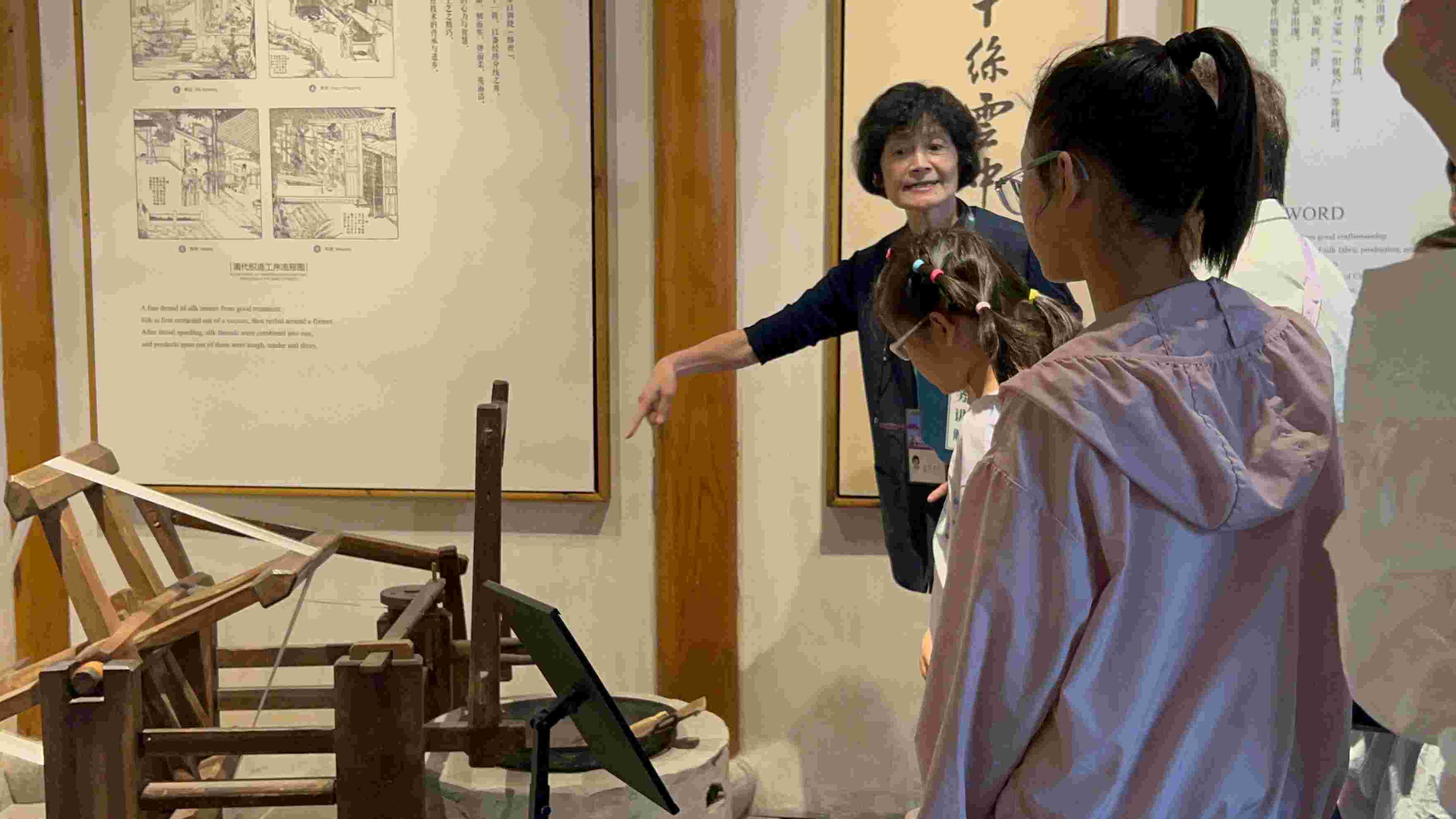 為了更深入了解絲綢文化,團隊還邀請了蘇州博物館的志愿者吳阿姨進行講解。吳阿姨指著一件緙絲作品介紹道:“緙絲技藝十分獨特,采用‘通經斷緯’的方法織造,能織出正反兩面如一的精美圖案 ,這也是它被譽為‘織中之圣’的原因。”在吳阿姨的講解下,團隊成員們對絲綢技藝有了更深刻的認識。她又指著古老織機,講述“清代紡工序列圖”,從煮繭、繅絲到織綢,工序如歷史脈絡鋪展;面對官服補子展板,又詳解一品仙鶴、二品錦雞等紋樣的品級寓意,孩子們聽得入神。文物不再是冰冷展品,經講解串聯起往昔,讓絲綢文化的技藝傳承與規制智慧,借講解流入參觀者心間,延續著千年絲韻的溫度 。