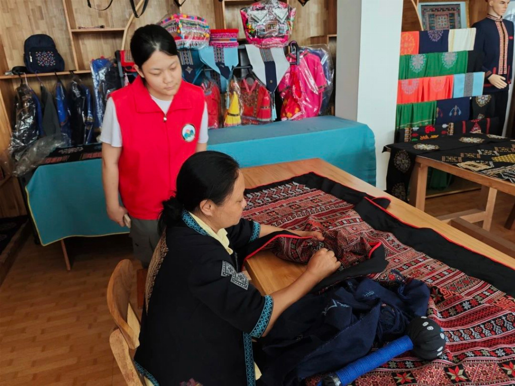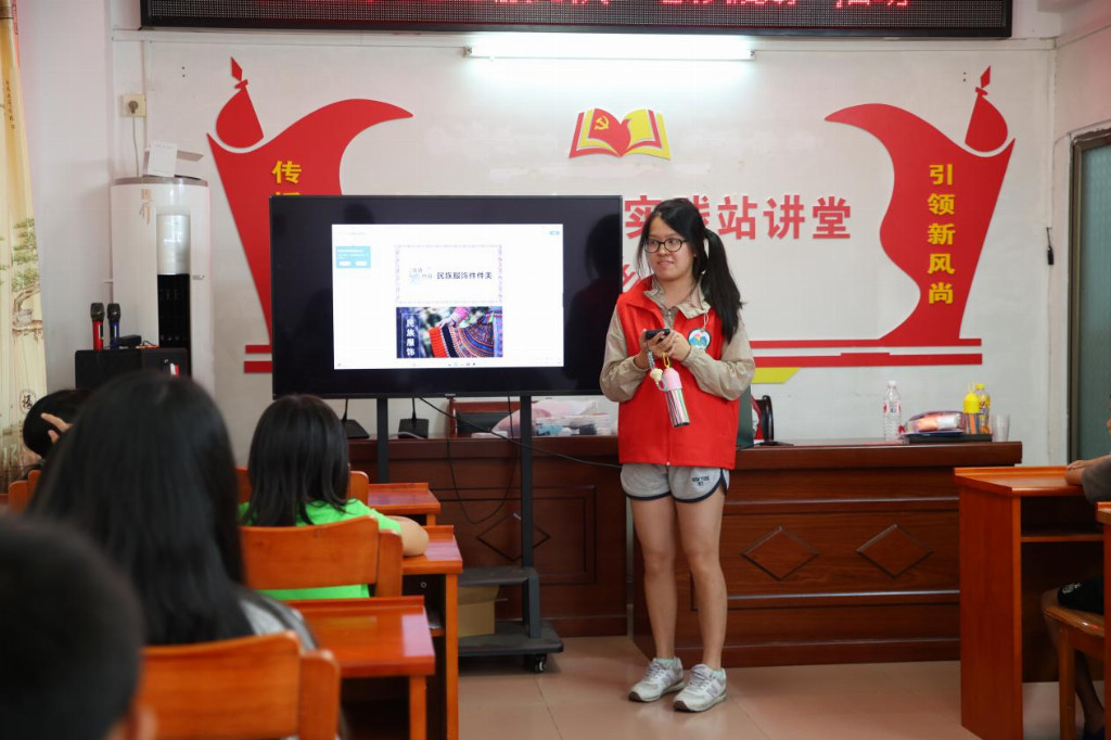 團隊深度訪談三位非遺傳承人:瑤繡非遺傳承人鄧小珍展示"反面刺繡"絕技,她分享著通過當地政府牽線,現在各種各樣的瑤繡作品都可以通過網上購物的方式購得。同時,隊員們還得知近期鎮里正在籌備瑤繡產品的帶貨直播,期待通過新科技讓瑤繡走得更遠;韶關市市級非遺項目瑤族盤王節傳承人趙良香向同學們介紹盤王節的歷史與習俗,每年農歷十月十六日,瑤族人民便起舞歌樂,緬懷祖先,祈福請愿。