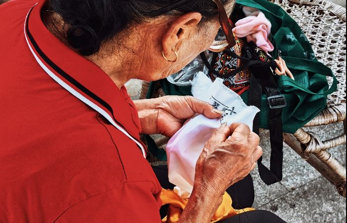 我們的足跡穿過鄉間小路,走進必背鎮。街道整潔,樹影斑駁,卻似少了些青春的聲響。我們的出現,引來廊下正低頭刺繡的繡娘目光。她麥色的臉上漾開和藹的笑,眼角的皺紋如梯田般層層展開:“好久沒有年輕人來這兒了……”那一瞬間,她的眼神里有驚喜,有懷念,還有一絲難以言說的落寞。