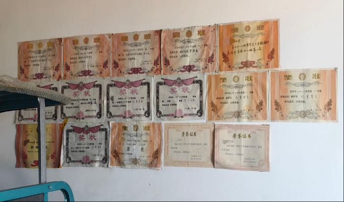 走進大悟陳同學的家,第一眼看到的,便是整面墻上琳瑯滿目的獎狀。墻上獎狀的發(fā)黃字跡,雖已褪去昔日的光彩,卻承載著他多年勤學不輟的腳步與汗水?v然生活清苦,家境拮據(jù),但他始終勤學好問、不改初心。隊員們久久凝望,心中涌起的,不只是感動,更是敬意——那一面獎狀墻,不僅見證了他個人榮譽,更是逆境中不屈精神的生動寫照。