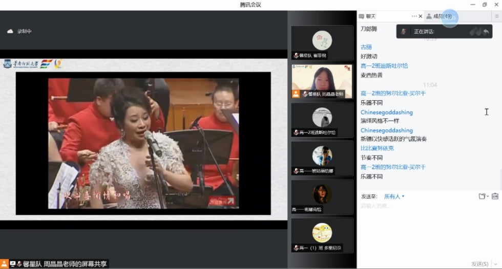 緊接著,小周老師圍繞木卡姆與粵曲兩大藝術,由淺入深,引導學生將其對比論證,探討中國非遺文化共同的基因密碼。通過啟發式的教學方法,小周老師著重從社會價值、情感價值和精神價值三個層面梳理非遺文化之間的內在聯系,強調中國非遺文化所傳承的精神都是我們共同的民族精神,并且點明其對賡續民族精神、建設文化強國的重要性。最后,小周老師對課堂進行了總結,并鼓勵學生們傳承好非物質文化遺產,在中華民族文化的土壤上培育飽滿的幸福之果。