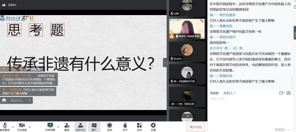 2022年7月19日,為了引導少數民族地區青少年學生更加全面準確地認識中華民族的歷史傳統和非物質文化遺產,增進文化認同,華南師范大學哲學與社會發展學院學生會馨星隊(以下簡稱馨星隊)于騰訊會議平臺為新疆維吾爾自治區喀什市深塔中學的高一學生講授以“非·凡,遺·產”為主題的特色課程,主講人為隊伍文教板塊隊員周晶晶。
