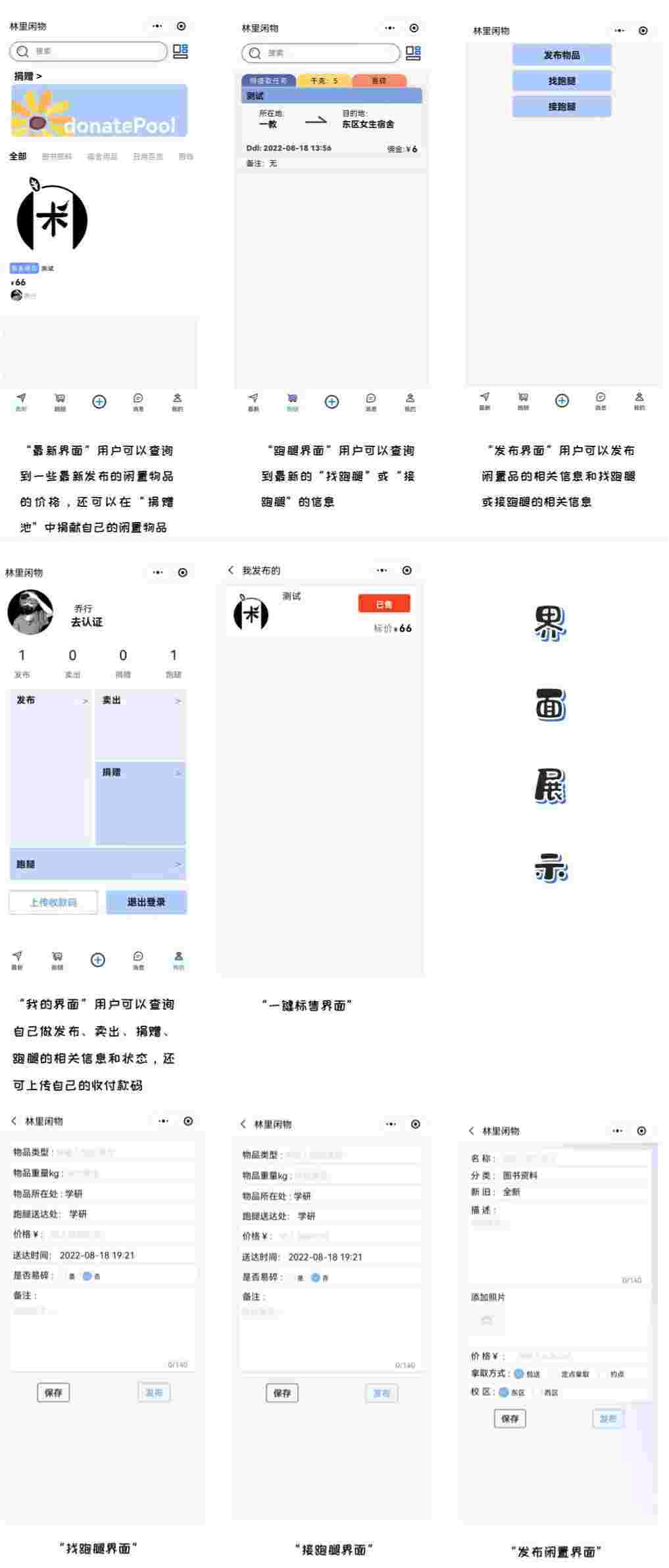 為解決校園生活中閑置物品資源浪費、各大閑置群信息整合性低、各大閑置群中垃圾信息較多、閑置物品交易售后不便、學(xué)生缺少“找跑腿”的相關(guān)途徑等問題,北京林業(yè)大學(xué)林里閑物團隊結(jié)合本專業(yè)特色,從2022年7月1日到2022年8月18日進行了為期一個半月的暑期社會實踐,打造了一款功能全面、交易便捷方便、交易信息整合化的二手閑置物品交易平臺,經(jīng)過一個半月的努力我們的小程序已初見雛形,并發(fā)布了1.0版本。
