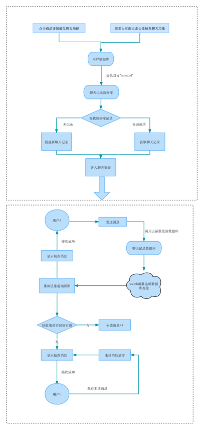 聊天模塊主要基于微信云開發(fā)實現(xiàn)數(shù)據(jù)庫操作,調(diào)用云函數(shù)獲取用戶唯一標識”open_id“,以此為關(guān)鍵字進行數(shù)據(jù)搜索,依據(jù)搜索結(jié)果實現(xiàn)聊天數(shù)據(jù)的添加丶更新,并通過watch函數(shù)監(jiān)聽數(shù)據(jù)庫變化,達到實時通信。