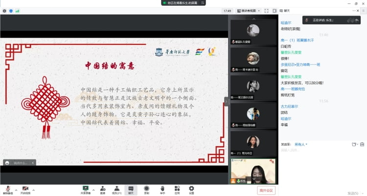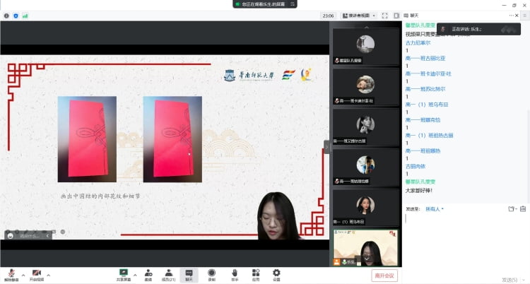 緊接著,她為同學們播放由剪紙形象呈現的民間故事。影片中,剪紙呈現的動畫形象栩栩如生,視頻尚未播完,有同學就已經迫不及待在聊天框里打出了故事的名稱“白蛇傳”。趁著同學們觀看視頻后熱情高漲,梁斐然及時地拋出提問:“同學們在日常生活中都見過哪些剪紙元素呢?”“窗花”“剪紙”“燈籠”……同學們紛紛在聊天框寫下自己的答案。