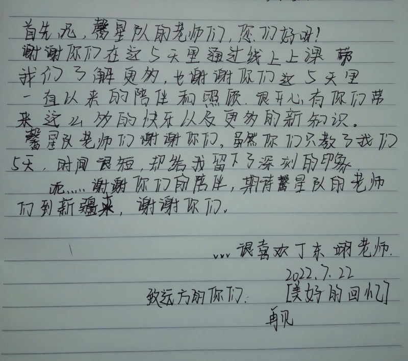 7月22日下午,華南師范大學哲學與社會發展學院馨星隊全體成員與新疆維吾爾自治區喀什市深塔中學的高一同學們跨越4160公里的距離,在“云端”上舉行閉營儀式。在隊長馬英柏的主持下,為期5天的“非遺牽起文化結,認同澆灌民族花”云下鄉活動正式落下帷幕。