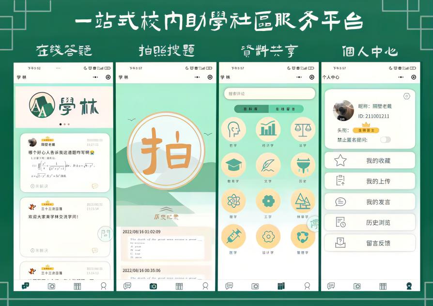 2022年8月23日上午九時,由北京林業(yè)大學(xué)信息學(xué)院蘇曉慧老師和劉宇通老師指導(dǎo)的“學(xué)林”小程序開發(fā)實踐團隊已正式公布6.0版本的更新。“學(xué)林”是一款由來自北京林業(yè)大學(xué)信息學(xué)院的本科學(xué)生自主立項開發(fā)的一體式在線學(xué)習(xí)答疑小程序,應(yīng)用了包括前端開發(fā)、數(shù)據(jù)庫搭建等方面的專業(yè)知識,由在線答疑、拍照搜題、資料共享、個人中心四個主模塊構(gòu)成。團隊名稱“學(xué)林”取自《漢書·敘傳下》中的“函雅故,通古今,正文字,惟學(xué)林”,意為學(xué)問的總匯。“學(xué)林”的宗旨是將團隊學(xué)到的信息技術(shù)轉(zhuǎn)化為對于社會實際有用的成果,通過搭建一體式學(xué)習(xí)小程序“學(xué)林”來幫助同學(xué)們更好地學(xué)習(xí)進步。