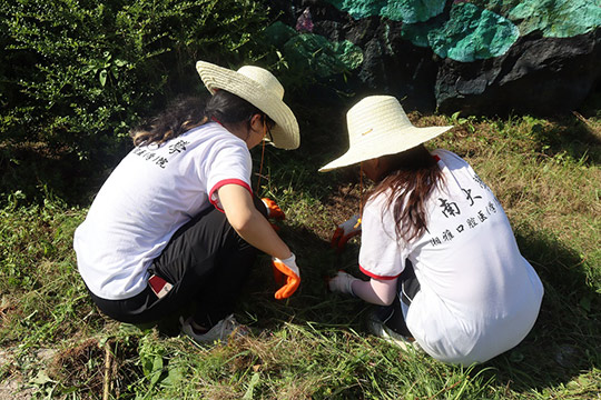 圖為一位團隊成員將剛清理出來的雜草交給另一位成員,準備傳遞至路邊的草堆。