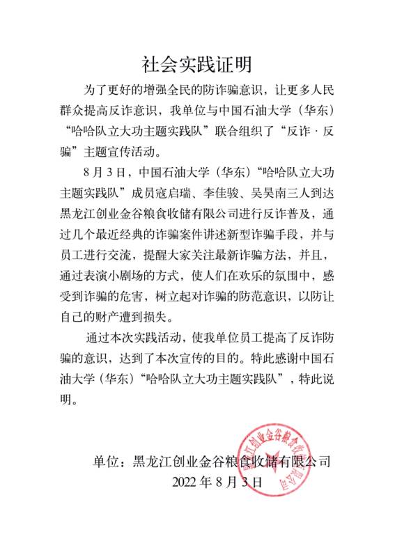 在現(xiàn)如今的社會,詐騙案件越來越多,手段也越來越高明,為增強大家防騙意識,中國石油大學(華東)“哈哈隊立大功主題實踐隊”與黑龍江創(chuàng)業(yè)金谷糧食收儲有限公司于2022年8月3日聯(lián)合組織了“反詐.反騙”主題宣傳活動。