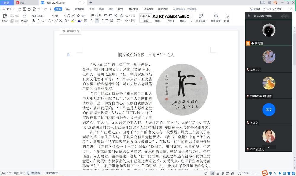 通過這次線上宣講活動,大家對于儒家“仁”這一思想有了更深的感悟與體會,也對自己家鄉戲劇文化有了更深入的了解,總體達到宣講的目的。讓大家意識到儒家仁學思想作為中華民族恢弘歷史中的寶貴精神積累和儲存,理應在中華民族偉大復興的關鍵節點上煥發出新的生機。我們應合理吸收儒家仁學思想適用于當今社會的內核與精華,讓儒家思想深入日常生活,不斷提高自身道德修養,為中華民族偉大復興貢獻自己的智慧和力量。