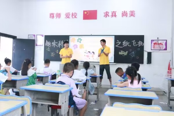 (圖為志愿者早上接孩子們) 上午志愿者們開展了趣味科學之折紙飛機、朋友你真棒、垃圾分類…特色課程,理論知識課堂插入游戲插入運動,強集體主義觀念和責任感,增強創新力和能動力。