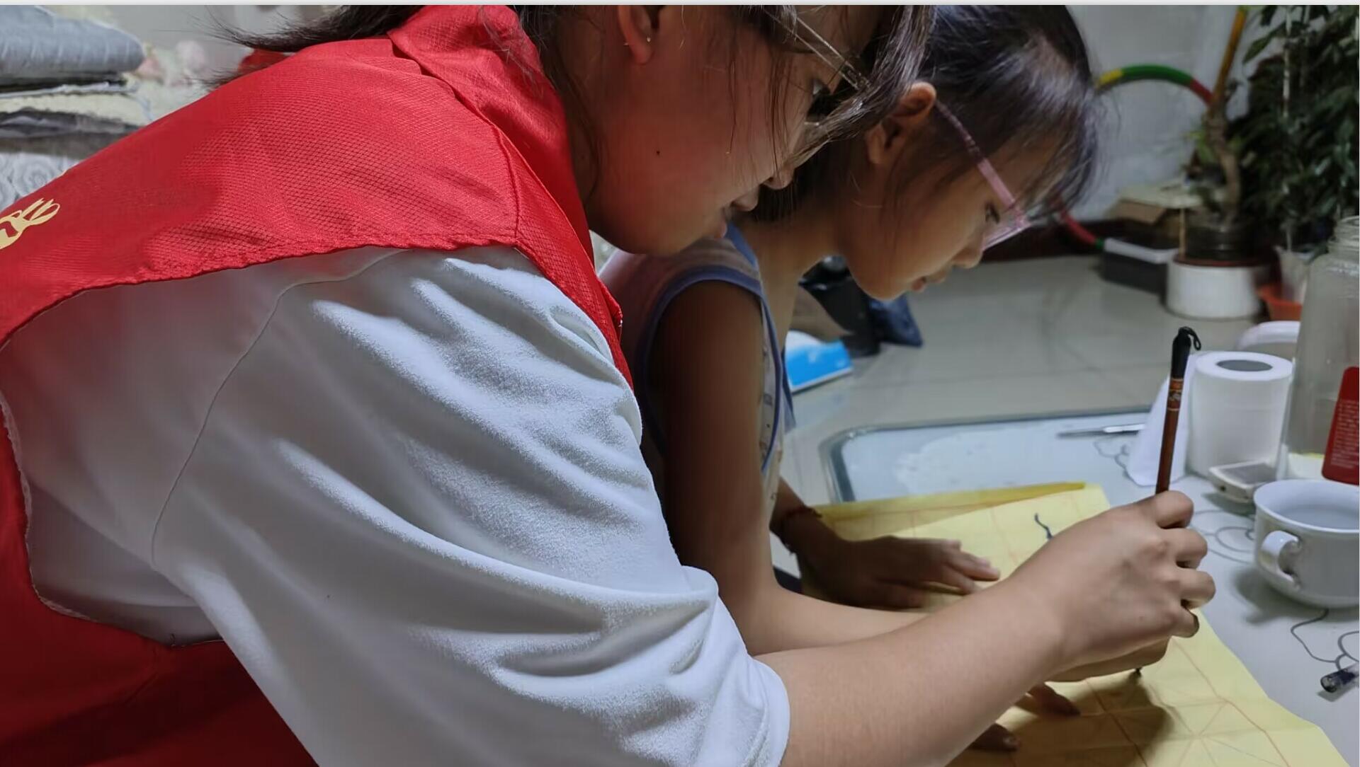 圖為基層連線,共鐫曙光隊隊員與同學們一起練習毛筆字。通訊員 李雅馨 供圖