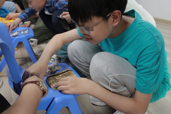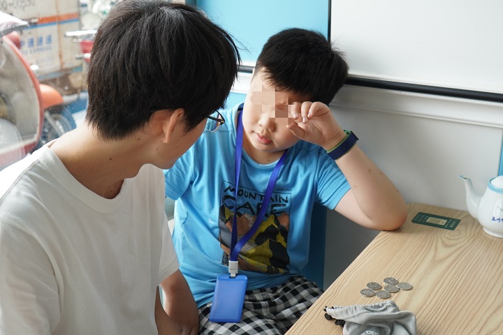 圖為星寶們在志愿者幫助下數(shù)零花錢。多彩大學(xué)生網(wǎng) 通訊員 黃怡 攝