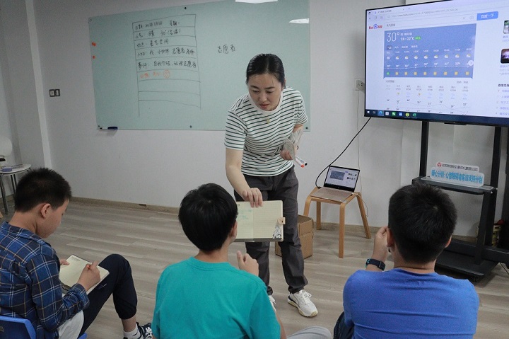 暑期課堂的第一天,也是星寶們和志愿者們初次相識的一天。星寶們首先向志愿者們介紹自己,“大家好,我是XXX,我喜歡打籃球,我是籃球小王子……”星寶們一番活潑有趣的自我介紹后,陪護(hù)志愿者們熟悉了星寶們的性格特征及相關(guān)癥狀,彼此之間的距離也越來越近。而后由星藝空間特教老師帶領(lǐng)星寶們完成當(dāng)天的圖文日記。在老師的提示下,星寶們知道可以通過看電話手表知悉當(dāng)天的日期與時間,還知道可以通過觀察門外的景象來知曉季節(jié)的更替與天氣的變化。等每位星寶對這些內(nèi)容都熟悉后,陪護(hù)志愿者引導(dǎo)星寶在手賬本上,以書寫或者繪畫形式記錄自己周圍的環(huán)境信息。時間、地點、天氣、人物、心情……一筆一劃里滿是星寶對課程的喜愛、享受與期待。