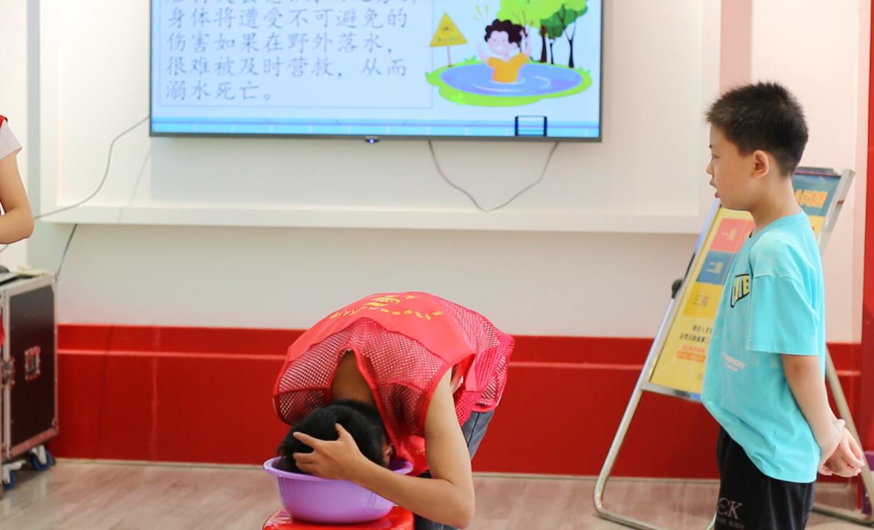 此外,實踐團成員還向同學們傳授安全有效的防溺水措施,提高學生遇險時的自救能力。通過一場簡易的防溺水實操演練,讓其親身體驗,進一步加深孩子們對于防溺水的安全意識。參與演練的小卓同學分享道,“溺水時感覺心里悶悶的,呼吸不過來。”他表示,自己學會了遇險緊急措施,并意識到私自下水是十分危險的行為,應該把生命放在首位。