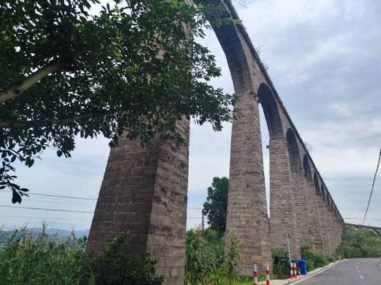 紅星渡槽于1968年1月開工,1972年12月竣工,高架槽基礎寬3.5米,最高橋墩高28米,單拱最大跨度49米,槽內為三合泥地坪,內寬1米,內空高0.88米,槽沿0.3米。七百多米的渡槽,當年施工現場常年都有200余名石匠和民工在施工,最多時工人高達1000余人,均是來自周邊各村的村民,他們有的挖地基,有的修正石頭……工地一片繁忙,甚至夜里也點著汽油燈繼續干。饒是如此,整個工期也花了4年才竣工。一晃五十年過去,紅星渡槽有如長虹臥波,巍然屹立,依然蔚為壯觀。