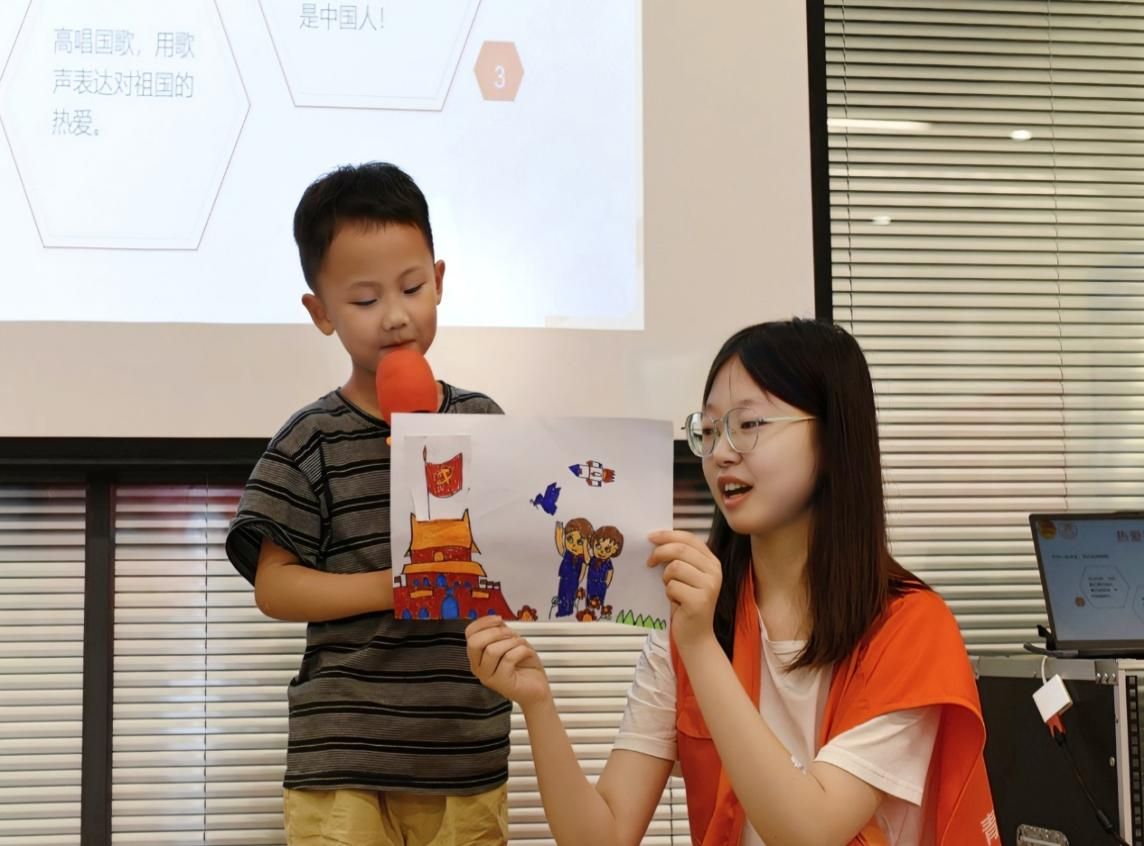 畫筆描繪未來,爭做強國少年 生于國旗下,長在春風里。為提高民族自豪感,激發愛國熱情,志愿服務團讓小朋友們借助畫筆描繪自己心中的美麗家國。課堂上,志愿者老師通過視頻和圖片講解,帶領小朋友們一起觀看天安門前的升旗儀式,以紙筆為媒,以夢為馬,用小小的畫筆描繪飄揚的五星紅旗、壯闊的天安門和朝氣蓬勃的少先隊員。所見皆入畫,為祖國的美景增添絢麗的光彩。用紅色表達血脈里永不褪色的赤誠,用黃色象征千萬年來的光明,以寸心寄華夏,將童夢贈山河。