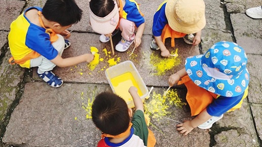 看到小朋友們已經迫不及待了,老師和“五彩樂迪”的隊員們便給他們分發小圍裙和吹畫材料,一個個“小藝術家”們就這樣誕生了。小朋友們在吹畫過程中運用各種色彩,發揮自己的想象力,不斷創作。“五彩樂迪”的成員時刻關注著小朋友們,避免他們受傷或出現誤吸顏料的情況,并記錄下小朋友們投入的神情。青石板上被小朋友們涂上了漂亮的顏色,吹出了七彩的圖畫。小朋友們盡情創作,彼此交流想法,玩得不亦樂乎。