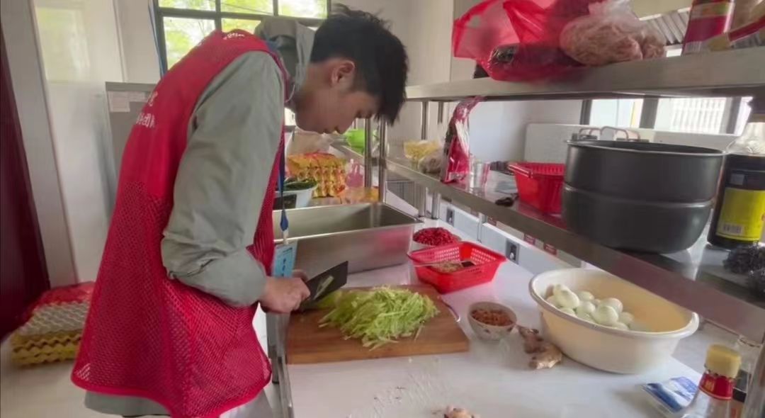 后勤組在悶熱的夏天中仍堅持做出美味的佳肴。當一切工作準備就緒以后,他們分工明確,保證大家能夠準時吃飯。由于廚房環境惡劣,他們每每做飯都大汗淋漓,盡管如此,他們還是傾盡熱愛,為大家烹飪一道道美食。一頓忙碌之后,一道道美味佳肴被端上了飯桌,在油與菜相遇的那一刻,誘人的味道瞬間彌散開來。