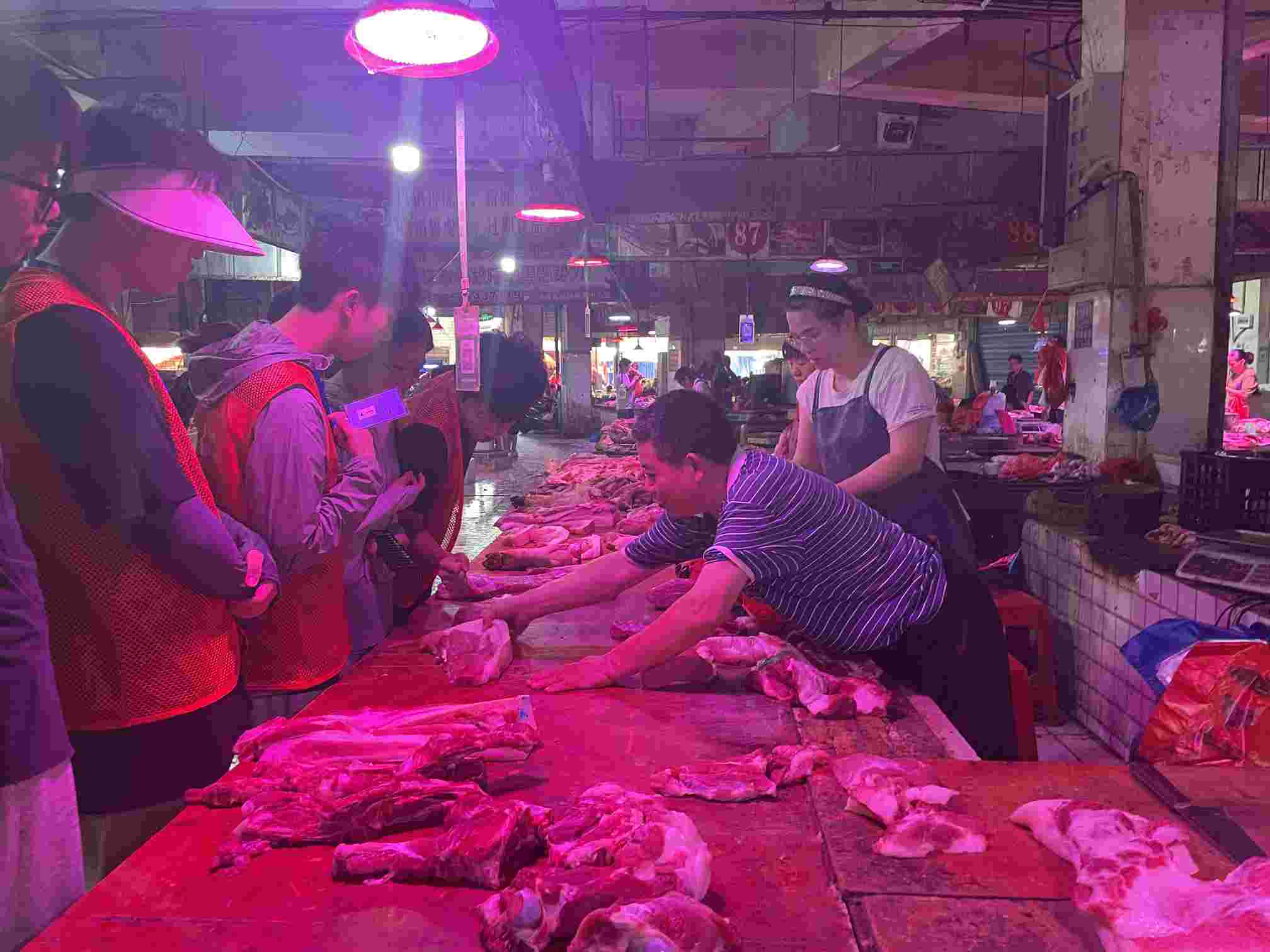 上午七點,后勤組前往三角坪農貿市場,為實踐隊成員挑選新鮮的食材。