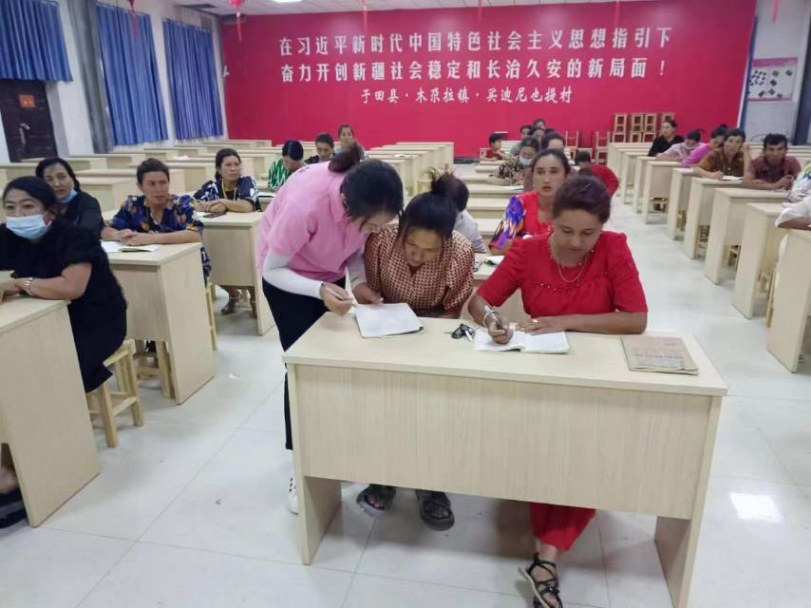- 塔里木大學(xué)學(xué)子在和田地區(qū)于田縣買迪尼也提村給農(nóng)牧民開展國語夜校的工作,帶領(lǐng)農(nóng)牧民學(xué)習(xí)普通話,推進(jìn)普通話進(jìn)鄉(xiāng)村,提高農(nóng)牧民普通話