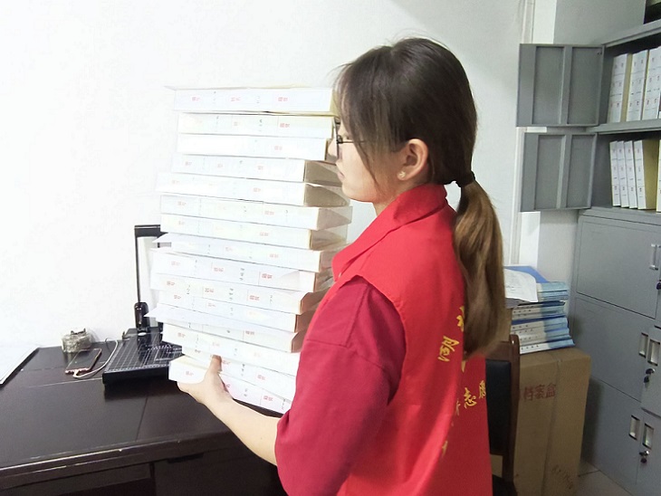 圖為實踐隊隊員在房縣人民醫院行政樓整理資料,給辦公的醫生減輕負擔提供力所能及的幫助。通訊員 胡欣怡 攝