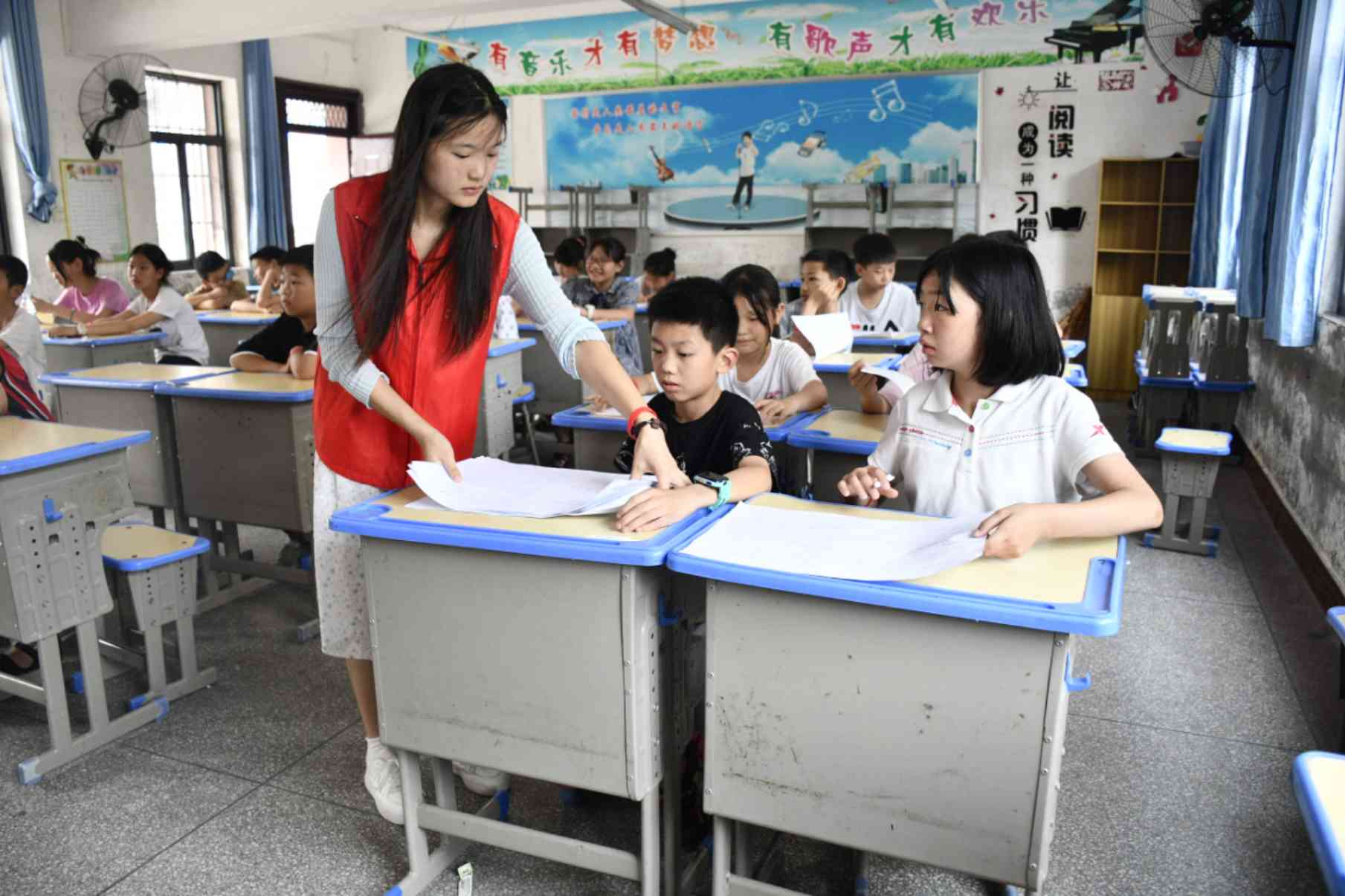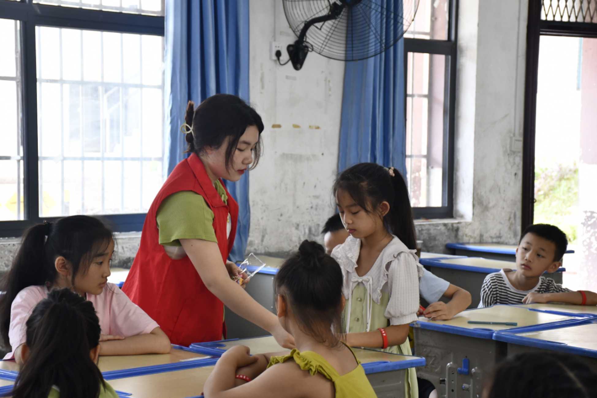 圖為實(shí)踐隊(duì)成員為表現(xiàn)積極的孩子們發(fā)小獎(jiǎng)品。