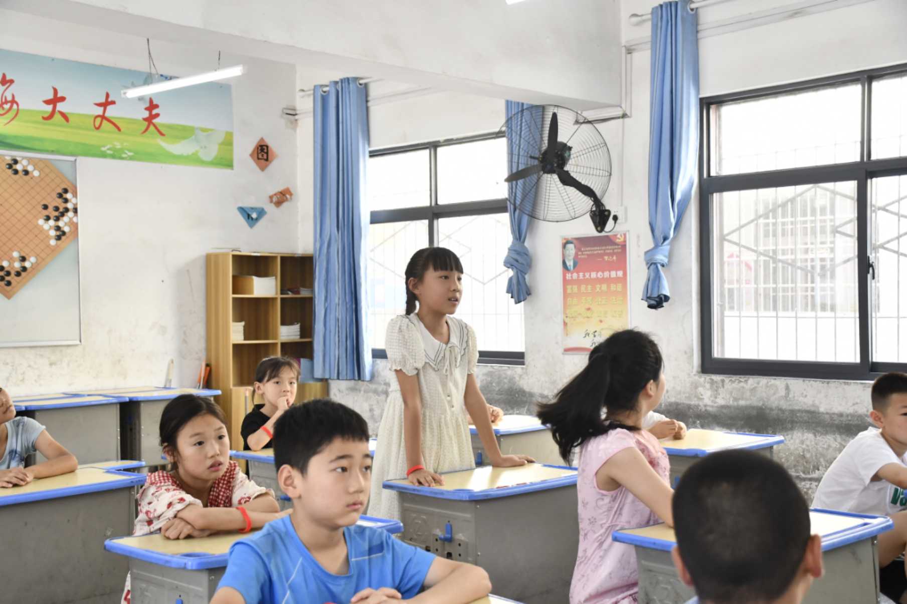 圖為防拐騙情景模擬中,孩子們舉手回答問(wèn)題。