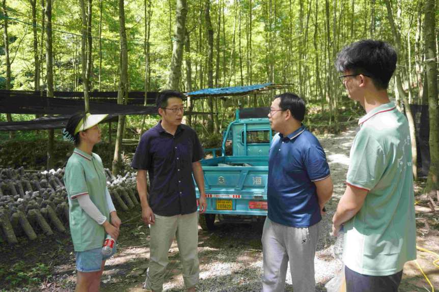 2023 年 7 月 11 日,實踐團隊成員在駐村第一書記羅少寧的帶領下,對溪里鳳村特色產業展開實地調研。溪里鳳村秉承“發展特色產業,助力鄉村振興”的發展思路,成立股份經濟合作聯社,對溪里鳳村70畝撂荒土地進行整理,建立菊花種植基地和香菇種植基地,生產和供給特色農產品,有力支撐“谷德茂林”鄉村品牌建設。
