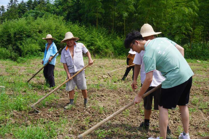 廣袤的田野是最好的老師,實踐團隊首先來到菊花種植基地,實地了解菊花種植情況,并對村民進項訪談,從當地村民的口中了解到溪里鳳村“兩委”班子敢于擔當,通過土地流轉,種植菊花等特色農作物,打造“谷德茂林”品牌,不但增加了村集體收入,還實現農民增收,村集體經濟收入從2019年的12.86萬增加到2022年的91.89萬。實踐隊員還深入了解村民對于谷德茂林品牌的預期,了解到谷德茂林優質農產品特有經營模式和發展共享的利益分配模式,并在村民的指導下進行鋤地勞動,感悟“勞動興農”發展戰略的深刻內涵。