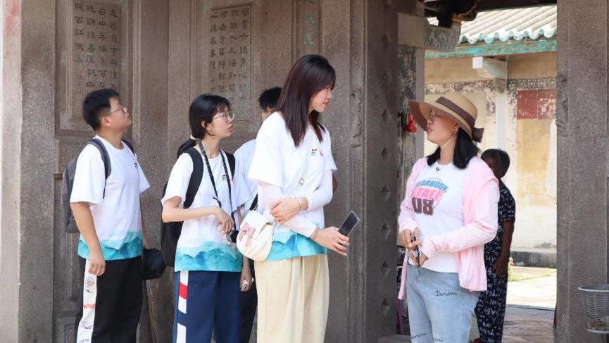 圖為 導游向新韓路隊員們講解景點 林梓璇 攝