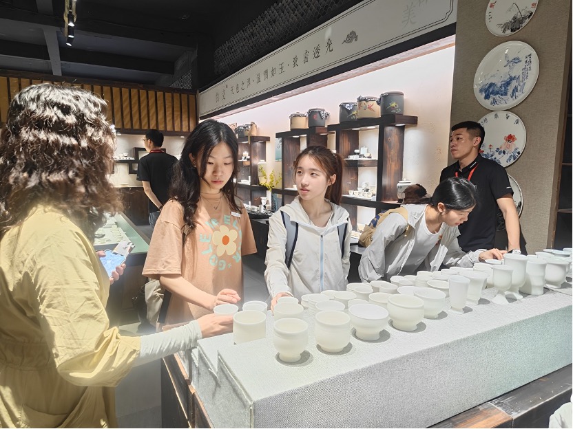 深入瓷器展廳,琳瑯滿(mǎn)目的瓷藝品讓人大開(kāi)眼界。如脂似玉的白瓷,是“中國(guó)白”與各釉色曲線相互交錯(cuò)的結(jié)果;融合不同民族文化的各系列文創(chuàng)產(chǎn)品,是優(yōu)秀傳統(tǒng)文化兼收并蓄的產(chǎn)物。在工作人員的帶領(lǐng)下,實(shí)踐隊(duì)員實(shí)地了解了企業(yè)的陶瓷制作、生產(chǎn)經(jīng)營(yíng)和轉(zhuǎn)型升級(jí)的情況,在沉浸于各式各樣精美陶瓷商品的同時(shí),更是在陶瓷的制作與經(jīng)營(yíng)知識(shí)方面受益匪淺。