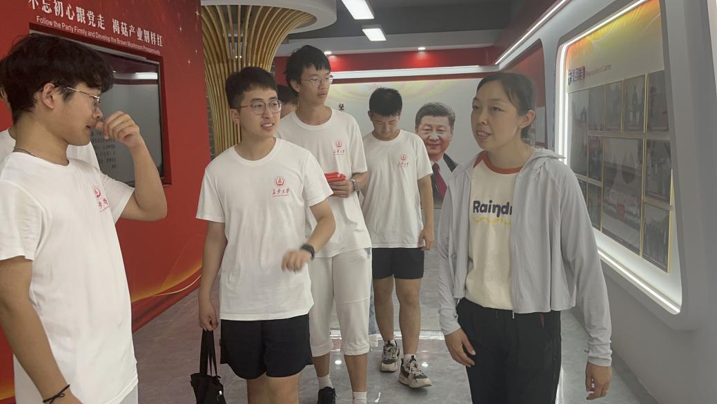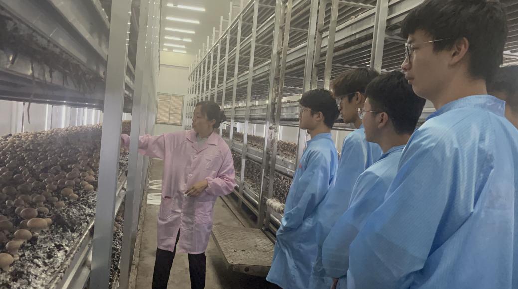 實踐團隊在菇房中進行參觀學習 不忘初心跟黨走,褐菇產業別樣紅在承載奧吉特菌業公司與張莊故事的記憶館內,孫主任提到自2014年開始張莊村便實施一系列鄉村振興項目,其中作為扶貧企業的奧吉特秉持“創新發展,合作共贏”的理念,同張莊村共行脫貧之路。