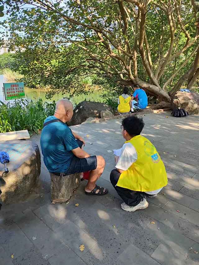 在巡河的過程中,小綠芽隊員對于河流存在的漂浮物拍照取證,并致電河流兩岸設立的河長公示牌監督電話進行反饋。此外,在途徑綠塘河生態濕地公園時,隊員們分發調查問卷,采訪當地的居民并宣傳河流保護理念,了解河流近年來發生的變化,對居民反饋的河流問題進行收集。