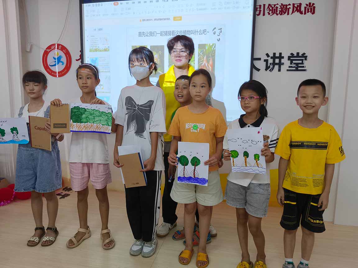 除在湛江書城開展小課堂外,在霞山區(qū)當(dāng)?shù)亟值篮蜕鐓^(qū)的支持下,小綠芽公益實(shí)踐團(tuán)隊(duì)伍成員來到了友誼街道文化站和洪屋社區(qū)新時代文明實(shí)踐站,為小朋友們開展《護(hù)河節(jié)水,環(huán)保先鋒》、《走進(jìn)紅樹林》等課程。
