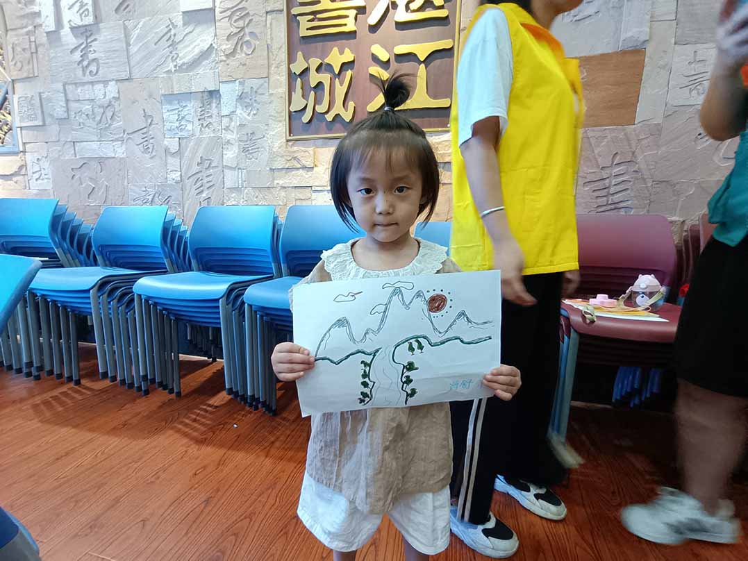 圖為小朋友展示繪畫作品“我心目中的最美河流”