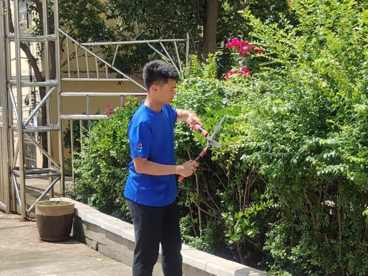 服務(wù)隊(duì)成員為敬老院花壇修建樹枝