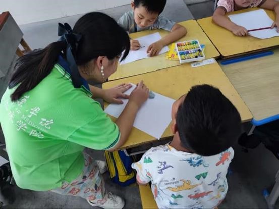 圖為副隊長田田老師和孩子們一起完成繪畫作品的場景。 湖北醫藥學院 郭坤 供圖