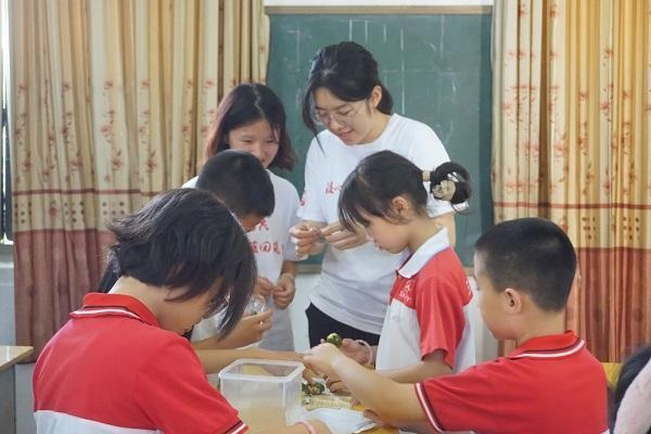 實踐團全體15名成員提前準備好制作壽司所需要的米飯、肉松等食材,分組帶領學生進行壽司的制作。學生們紛紛表示之前沒有過制作壽司的體驗,均以飽滿的熱情參與到了壽司的制作過程中。課程在學生們品嘗到親手制作的壽司中結束。孫佳佳表示,小朋友們臉上洋溢著的幸福笑容就是對于這堂課的最大認同。