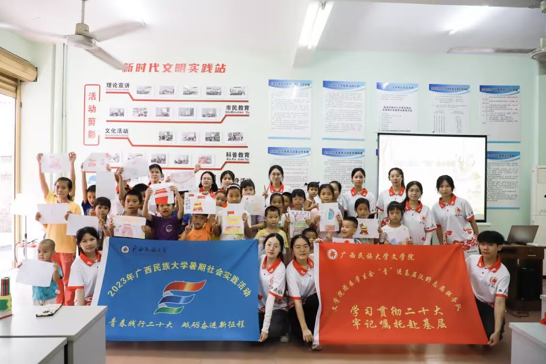 為深入基層傳遞紅色基因,培養(yǎng)少年兒童愛黨愛國情懷,7月15日,文學(xué)院團委學(xué)生會“‘青’進(jìn)基層沃野”志愿服務(wù)隊前往南寧市西鄉(xiāng)塘區(qū)上堯街道陳西村開展“學(xué)習(xí)二十大,‘繪’出心中國”主題繪畫活動,此次活動由志愿者寧延春主講, 陳西村20余名小朋友參與。