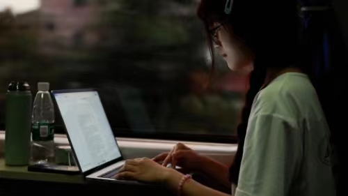 在長達1860公里的路程中,有波折、有疲憊,但隨著火車的前行,也有緊張與期待。在火車上,中國計量大學梭戛支教團隊的隊員們也辛勤準備著PPT文件和教案。在火車窗邊,電腦屏幕上映出沿途的山林和認真的臉龐。陳夢欣笑道:“雖然沿途風景迷人,但還是要好好工作呀!”