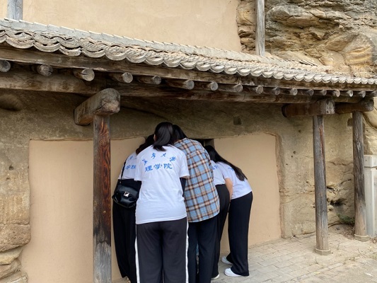 實踐隊伍一行人首先進入中共中央軍委總政治部舊址,隨后,參觀了毛澤東同志的辦公室。每個房間的設(shè)施都非常簡陋,當(dāng)年以毛澤東同志為首的領(lǐng)導(dǎo)人們就在這樣艱苦的工作環(huán)境中帶領(lǐng)廣大將士和群眾打贏了抗日戰(zhàn)爭。辦公室不遠就是防空洞,實踐隊員們看著防空洞就能想象出當(dāng)年那個戰(zhàn)火紛飛的場景,不論是領(lǐng)導(dǎo)人還是普通士兵,都是冒著隨時降臨的生命危險在英勇奮斗著的。他們有堅定的信念和大無畏的犧牲精神,這點激勵著實踐隊員們堅定自己的理想,勇敢拼搏。