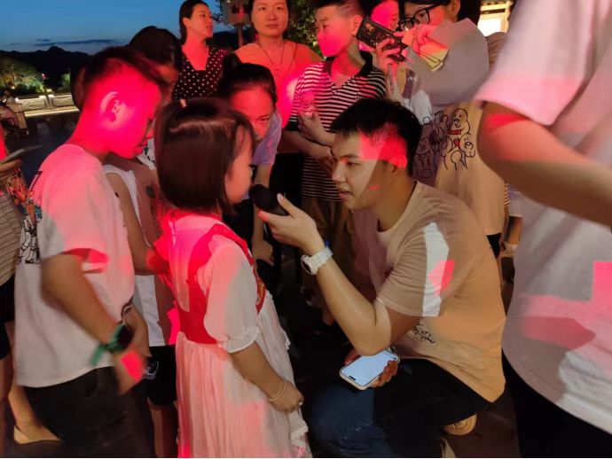 夜幕慢慢降臨,“三公”志愿服務(wù)團來到了湖邊進行普法節(jié)目表演,相聲、三句半、快板等語言藝術(shù)共同迸發(fā),推廣普通話同普法一起結(jié)合起來,讓現(xiàn)場的情緒到達頂端。